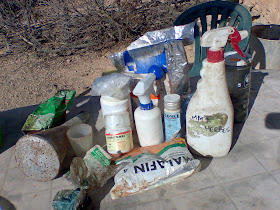 Es tiempo también de hacer repaso de nuestros recursos. Es el caso del cajón de los productos del huerto. Uy...qué yuyu...qué de polvos, líquidos y grumos variados...son sustancias de nuestra etapa de jardineros. En este oficio, es esencial la rapidez de acción: los clientes no toleran de ninguna manera las promesas, las lentitudes de la naturaleza: ni mariquitas, ni depredadores naturales ni leches en vinagre: hay pulgón ahora, y no quiero pulgón en cinco minutos...